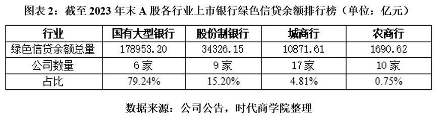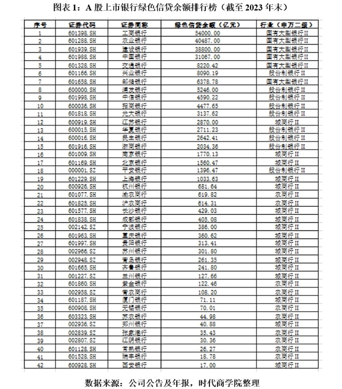 因此,时代商学院统计了A股上市银行2023年绿色信贷余额数据,以榜单的形式对上市银行绿色金融服务力度进行归纳与总结,如图表1所示。