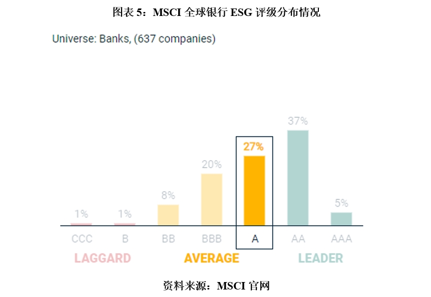 如图表5所示,MSCI在全球纳入了637家银行进入其ESG评级体系,其中,ESG评级为A级及以上的银行占比共计69%,只有约三成银行的ESG评级在BBB级及以下。