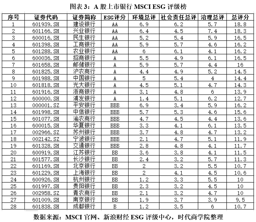 时代商学院研究发现,与全球银行相比,A股上市银行的MSCI ESG评级处于中等偏下的水平,不过未出现“落后水平”的CCC级。