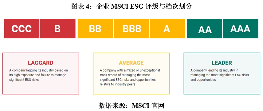 MSCI将企业的ESG评级分为七级三档,分别为“领先水平”(AAA级、AA级)、“一般水平”(A级、BBB级、BB级)、“落后水平”(B级、CCC级)。