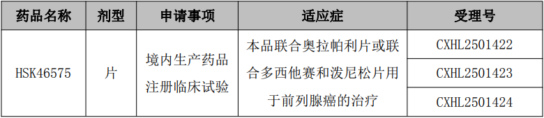 HSK46575片是公司自主研发的一种口服、强效和高选择性的小分子抑制剂,财盛证券拟用于前列腺癌的治疗,目前正在进行Ⅰ期临床研究。本次获得受理的为本品联合奥拉帕利片或联合多西他赛和泼尼松片用于前列腺癌的治疗适应症的临床试验申请。