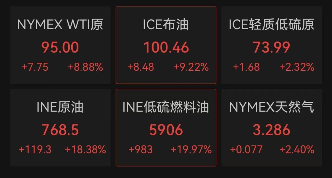 北京时间3月12日,国际油价再度飙升。Wind数据显示,截至北京时间3月12日11:27,NYMEX WTI原油期货主力合约大涨8.88%,报95美元/桶;ICE布油期货主力合约大涨9.22%,报100.46美元/桶。
